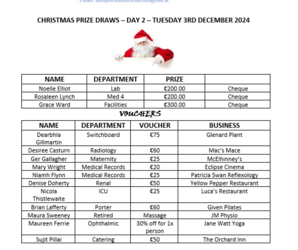 Please find attached the winners of the 2nd day Christmas Letterkenny Hospitals Sports and Social Club draw for this week. Prizes can be collected of our committee member Fin Begley @ Ext 4662. Cash prize winners may contact and collect their cheques from Niamh O’Donnell via her work mobile number @ 0874517792 or via email @niamh.odonnell4@hse.ie Congratulations to all of our winners and the very best of luck to everyone for the rest of the week.