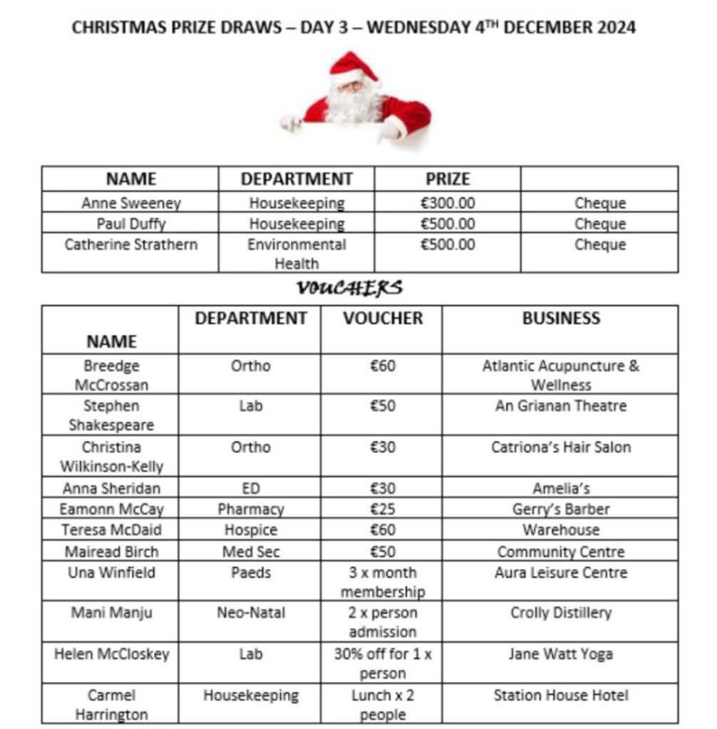 Day 3 winners & our cash prizes are getting bigger!! Please find attached the winners of the 3rd day Christmas Letterkenny Hospitals Sports and Social Club draw for this week. Prizes can be collected from our committee member Tracy Shannon at 0892603444 Cash prize winners may collect their cheques from Niamh O’Donnell via her work mobile number at 0874517792 or via email at niamh.odonnell4@hse.ie Congratulations to all of our winners and the very best of luck to everyone for the rest of the week.