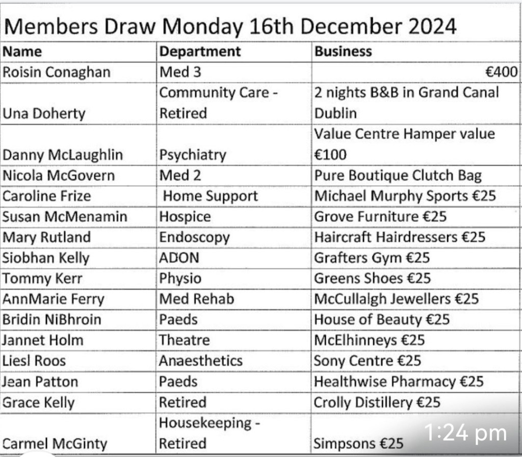 Please find attached the winners of our Letterkenny Hospitals Sports and Social Club extra draws as promised. Todays vouchers can be collected off our committee member Angela McGinley @tel 353(87)9322633. Cash prize winners may collect their cheques from Niamh O’Donnell via her work mobile number @ 0874517792 or via email @ niamh.odonnell4hse.ie Congratulations to all of our winners and the very best of luck to everyone for the rest of the week.