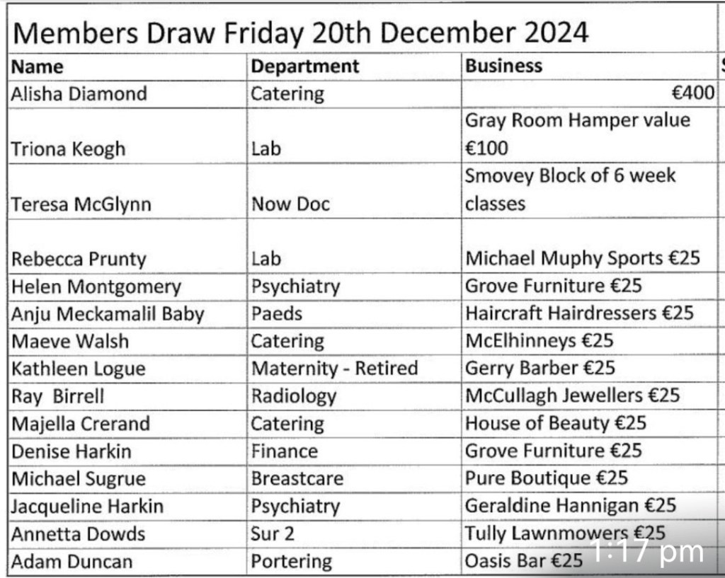 Please find attached the winners of our letterkenny Hospitals Sports and Social Club extra draws for Wednesday 18th December. Todays vouchers can be collected from Tracy Shannon @ 0892603444. Cash prize winners may collect their cheues from Niamh O’Donnell via her work mobile number @ 0874517792 or via email @ niamh.odonnell4@hse.ie Congratulations to all of our winners.