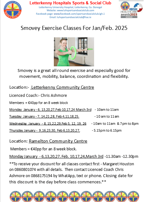 Kick-start the new year with our Smovey Exercise Classes commencing on Monday 6th January 2025. See poster for further information and on how to book a place. Posted by0860801074mDecember 31, 2024Posted inUncategorized Share this: Click to share on X (Opens in new window) X Click to share on Facebook (Opens in new window) Facebook Like Loading...