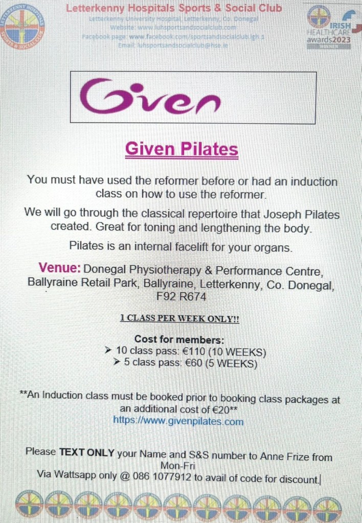 We have Given Pilates restarting for January 2025. Please see poster for further information & booking details. Please note that it is only 1 class per week that van be booked & these classes at this price are for LUH Sports & Social Club members only