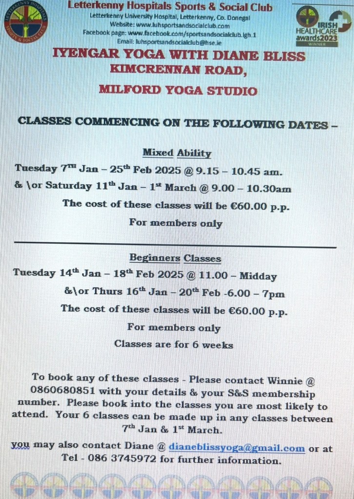 We have Iyengar Yoga with Diane Bliss restarting for January/February 2025. Please see poster for further information & booking details. Please note that these classes are for 6 weeks & that this price is for LUH Sports and Social members only. Posted by0860801074mJanuary 6, 2025Posted inUncategorized Share this: Click to share on X (Opens in new window) X Click to share on Facebook (Opens in new window) Facebook Like Loading...