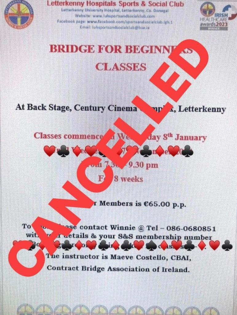 Just to inform any of you that we’re booked into the Bridge classes starting tonight Wed 8th Jan @ 7.30 – 9.30pm at Backstage Century Cinema Letterkenny, that this start date has been cancelled due to weather conditions. Posted by0860801074mJanuary 8, 2025Posted inUncategorized Share this: Click to share on X (Opens in new window) X Click to share on Facebook (Opens in new window) Facebook Like Loading...