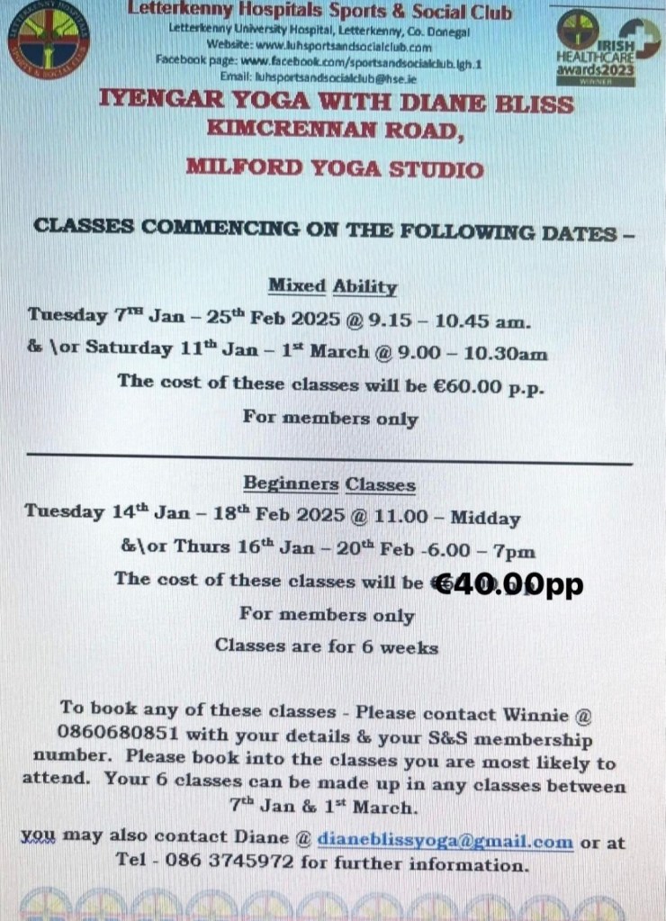 We have Iyengar Yoga with Diane Bliss restarting for January/February 2025. Please see poster for further information & booking details. Please note that these classes are for 6 weeks & that this price is for LUH Sports & Social members Only. Beginners Classes – €40pp Mixed Ability Classes – €60pp