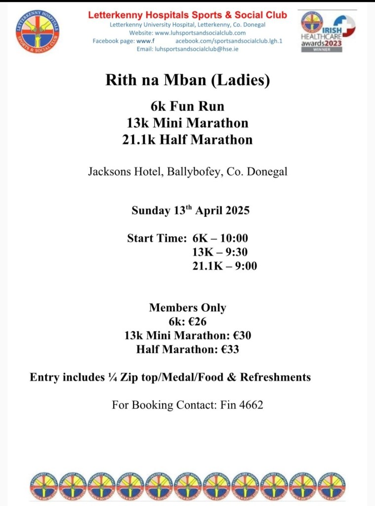 For any of our Female athletes, we will be offering a reduction in the Rith na Mban – 6k Fun Run, 13k Mini Marathon & 21.1K Half Marathon on Sunday 13th April 2025. Please see poster attached for further information and booking details. Posted by0860801074mJanuary 16, 2025Posted inUncategorized Share this: Click to share on X (Opens in new window) X Click to share on Facebook (Opens in new window) Facebook Like Loading...