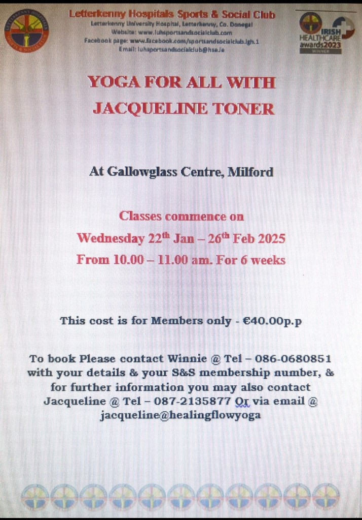 We have another 2 Yoga classes with Jacqueline Toner restarting. Please see poster attached for further information & booking details. Posted by0860801074mJanuary 16, 2025Posted inUncategorized Share this: Click to share on X (Opens in new window) X Click to share on Facebook (Opens in new window) Facebook Like Loading...