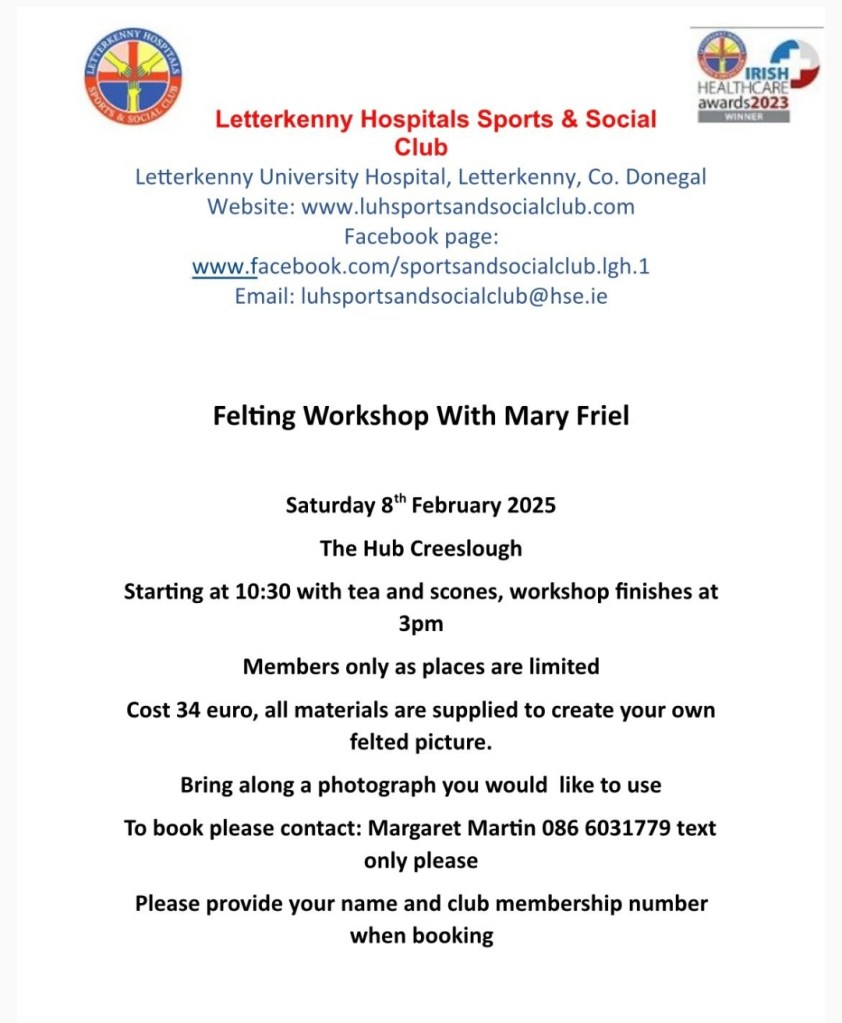 We have a new Felting workshop with Mary Friel, starting on Saturday 8th February 2025 in the Hub, Creeslough. Please see poster attached for further information and details. This class is for members only & can you please contact the person named on the poster attached to book