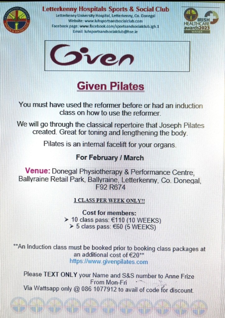 We have Given Pilates restarting for February 2025. Please see poster for further information & booking details. Please note that it is only 1 class per week that can be booked & these classes at this price for for LUH Sports & Social club members ONLY!