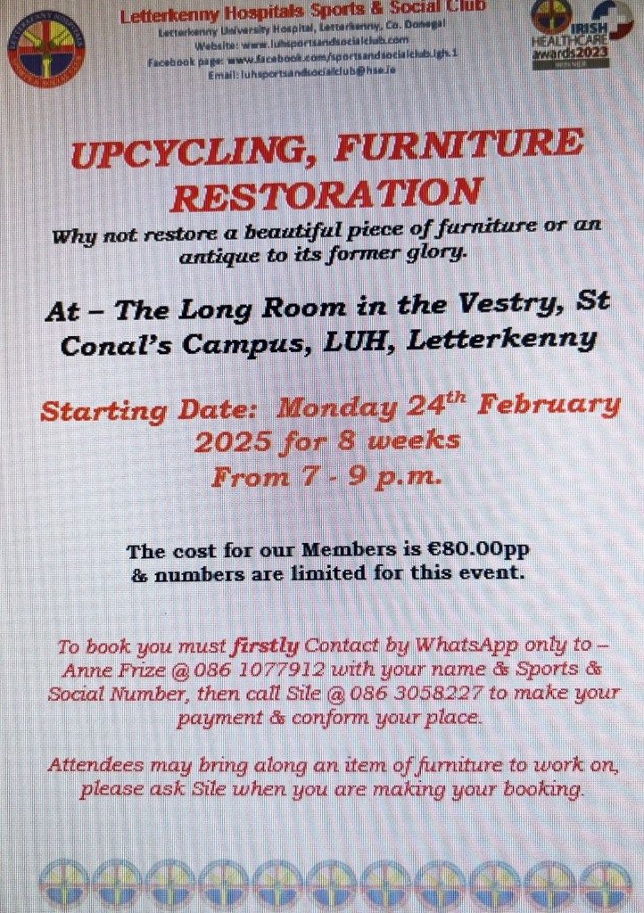 We have a new class of upcycling & furniture restoration starting on Monday 24th February 2025 for 8 weeks. There is limited availability for this class, so if you are interested please contact Anne at the number given below as soon as possible. Also please see poster attached for further information & booking details.