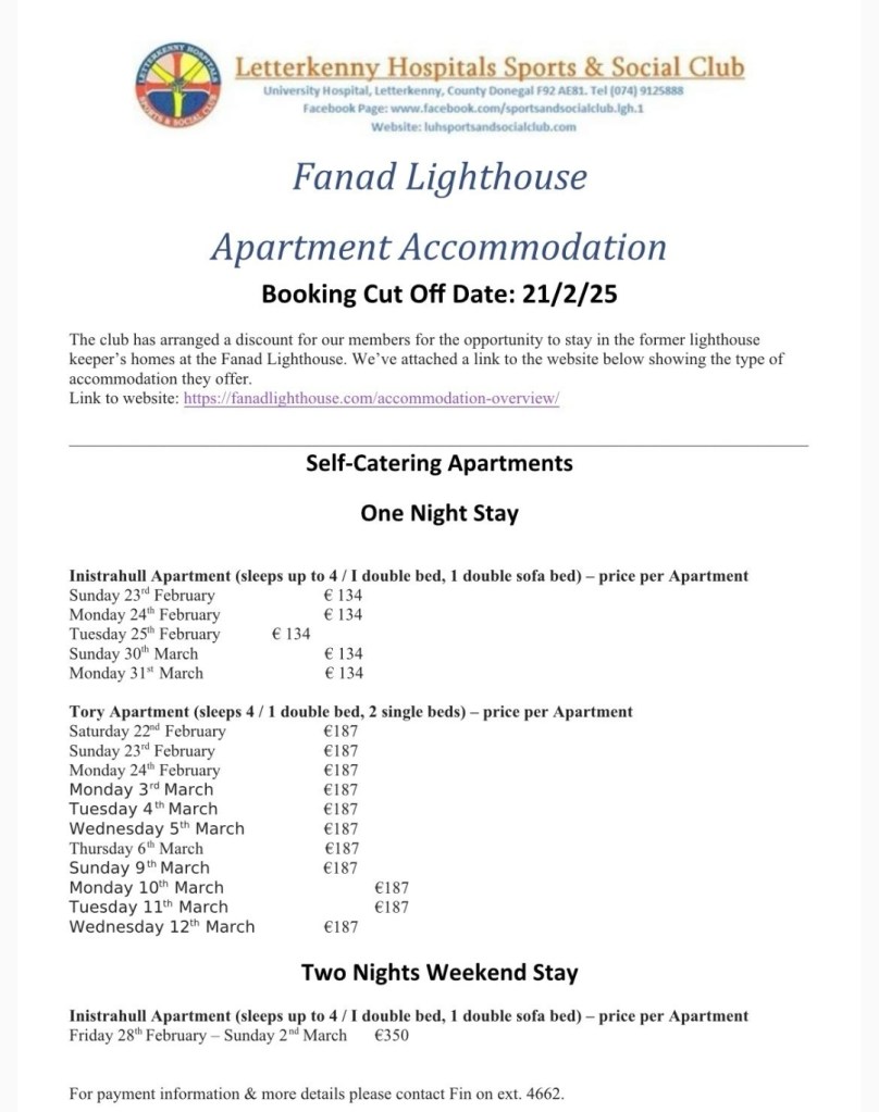 We have an amazing offer for some overnight stays at the beautiful Fanad Lighthouse accommodation for our members. Please see poster attached for further information and booking details. Also check out their website to see their wonderful apartments on the edge of the Fanad Cliffs https://fanadlighthouse.com