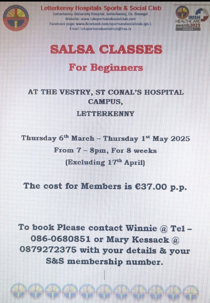 We have Salsa Classes for beginners starting Thursday 6th March for 8 weeks (exc 17th March). Please see poster for further information & booking details. Posted by0860801074mFebruary 17, 2025Posted inUncategorized Share this: Click to share on X (Opens in new window) X Click to share on Facebook (Opens in new window) Facebook Like Loading...