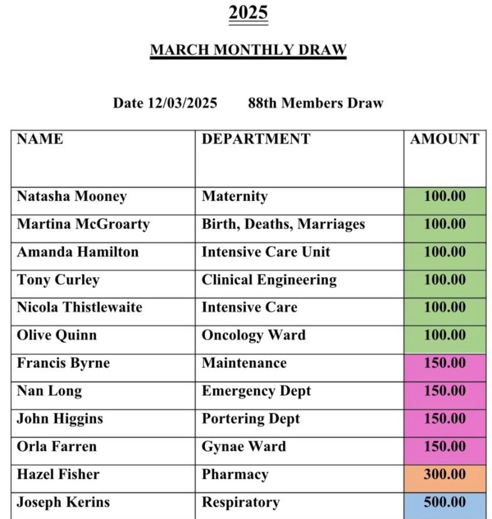 Congratulations to all of the winners of our draw for March 2025. Just to let everyone know that the winners may contact Tara Gallagher either by email @ tara.gallagher1@hse.ie or Ext – 4783 to let her know where to post the cheques to. Posted by0860801074mMarch 13, 2025Posted inUncategorized Share this: Click to share on X (Opens in new window) X Click to share on Facebook (Opens in new window) Facebook Like Loading...