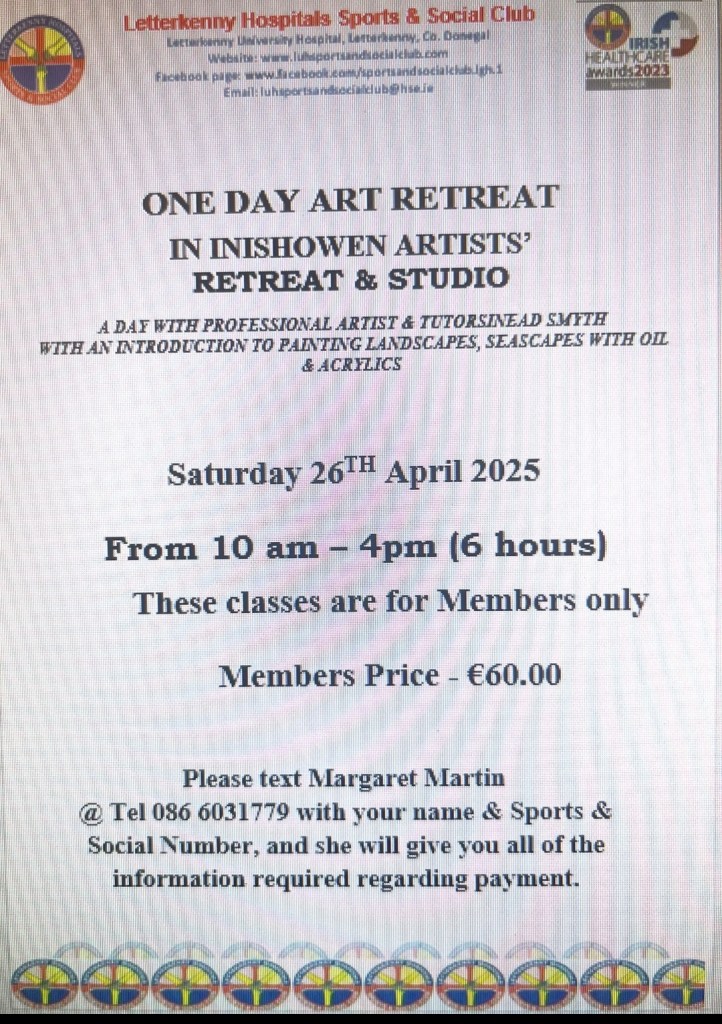 We are hosting a one day Art Retreat in Inishowen for any of our budding artists. This will take place on Sat. 26th April 2025. Please see poster attached for further details & booking information. Posted by0860801074mMarch 13, 2025Posted inUncategorized Share this: Click to share on X (Opens in new window) X Click to share on Facebook (Opens in new window) Facebook Like Loading...