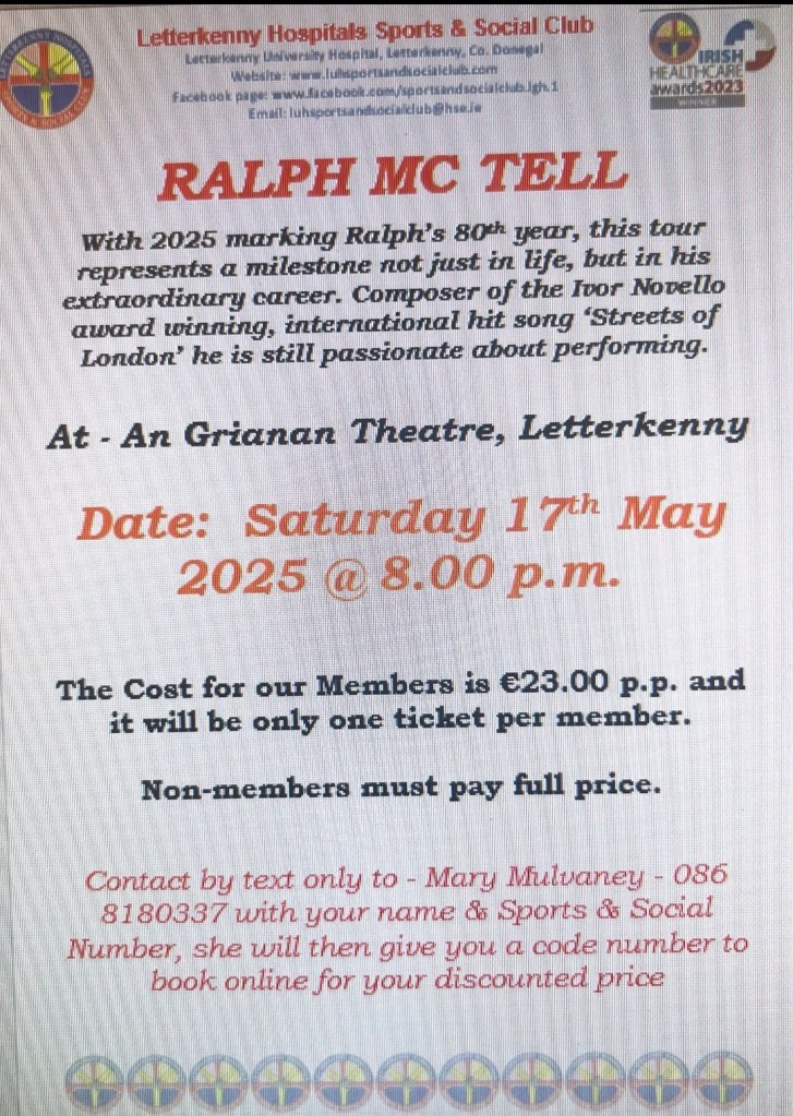 We have tickets for Ralph McTell in An Grianan Theatre on Saturday 17th May 2025. Please see poster attached for further information & booking details. These tickets are for members only & it will be only one ticket per member. Non members must pay full price.