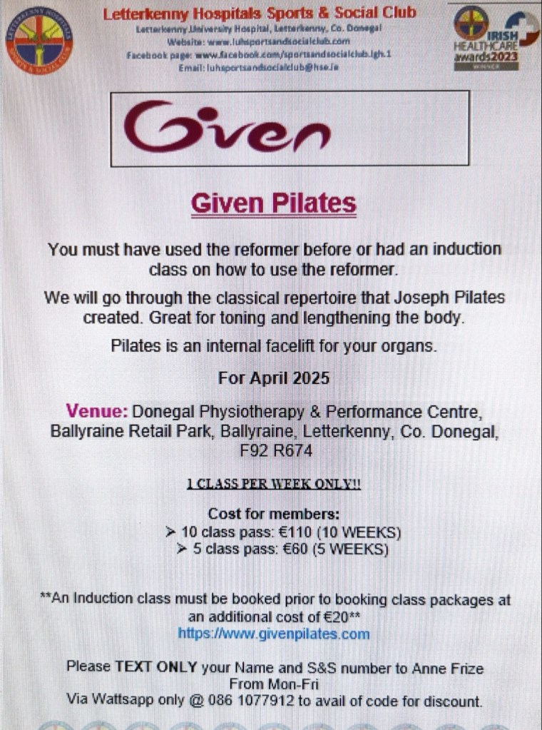 We have Given Pilates restarting for March 2025. Please see poster for further information & booking details. Please note that it is only 1 class per week that can be booked & these classes at this price are for LUH Sports & Social members only. Posted by0860801074mApril 2, 2025Posted inUncategorized Share this: Click to share on X (Opens in new window) X Click to share on Facebook (Opens in new window) Facebook Like Loading...