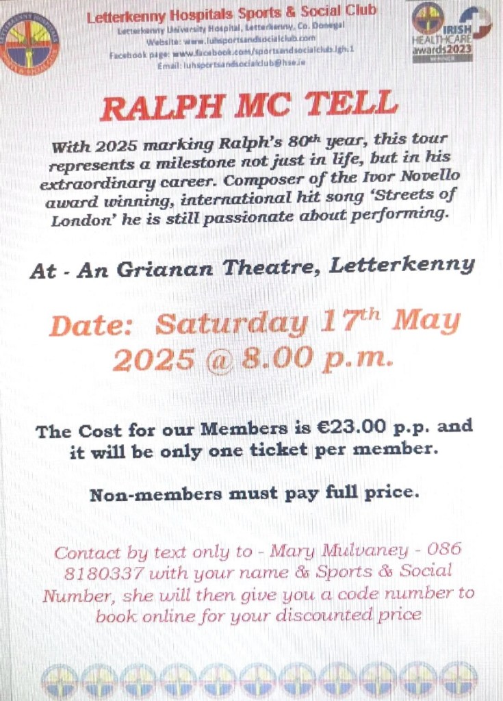 We still have tickets for Ralph McTell in An Grianan Theatre on Saturday 17th May 2025. Please see poster attached for further information & booking details. These tickets are for members only and it is only one ticket per member. Non members must pay full price.