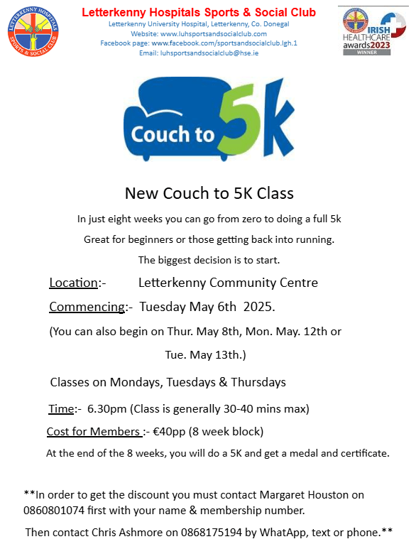 The next Couch to 5K is starting on Tuesday May 6th. Please see poster attached for further information and details on how to book. Posted by0860801074mApril 25, 2025Posted inUncategorized Share this: Click to share on X (Opens in new window) X Click to share on Facebook (Opens in new window) Facebook Like Loading...