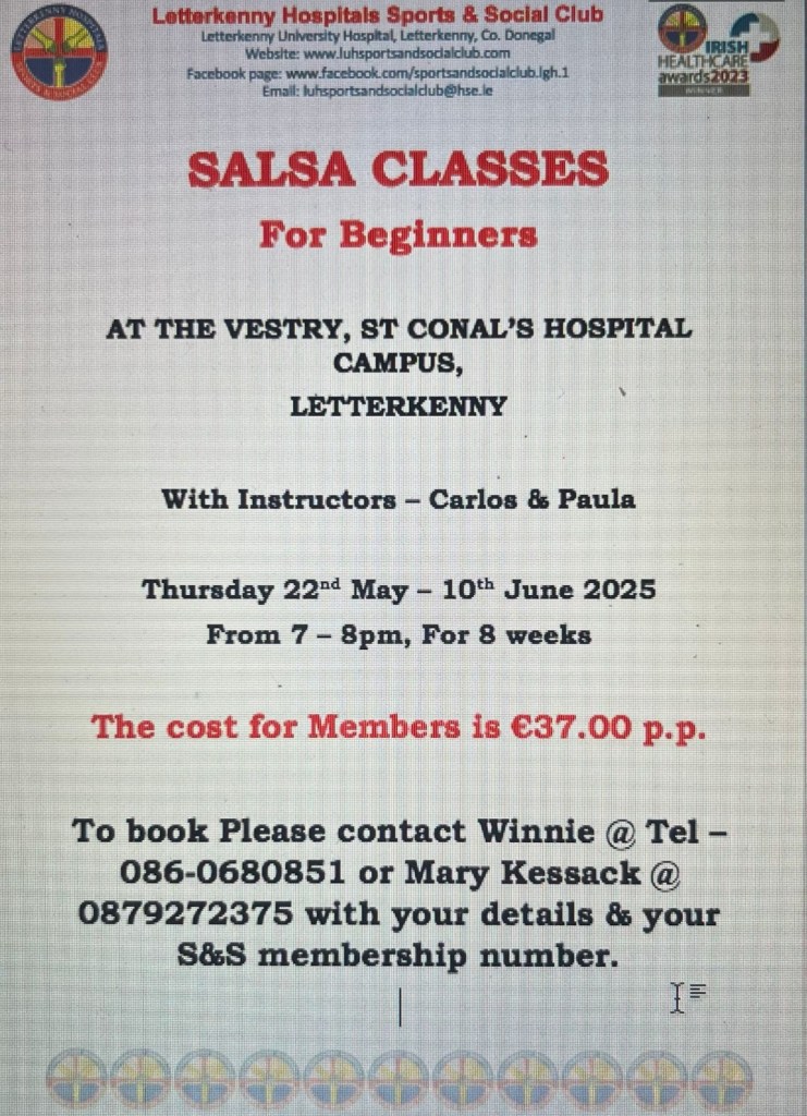 We have Salsa Classes for beginners starting Thursday 22nd May until 10th June 2025. Please see poster for further information & booking details. Posted by0860801074mMay 19, 2025Posted inUncategorized Share this: Click to share on X (Opens in new window) X Click to share on Facebook (Opens in new window) Facebook Like Loading...