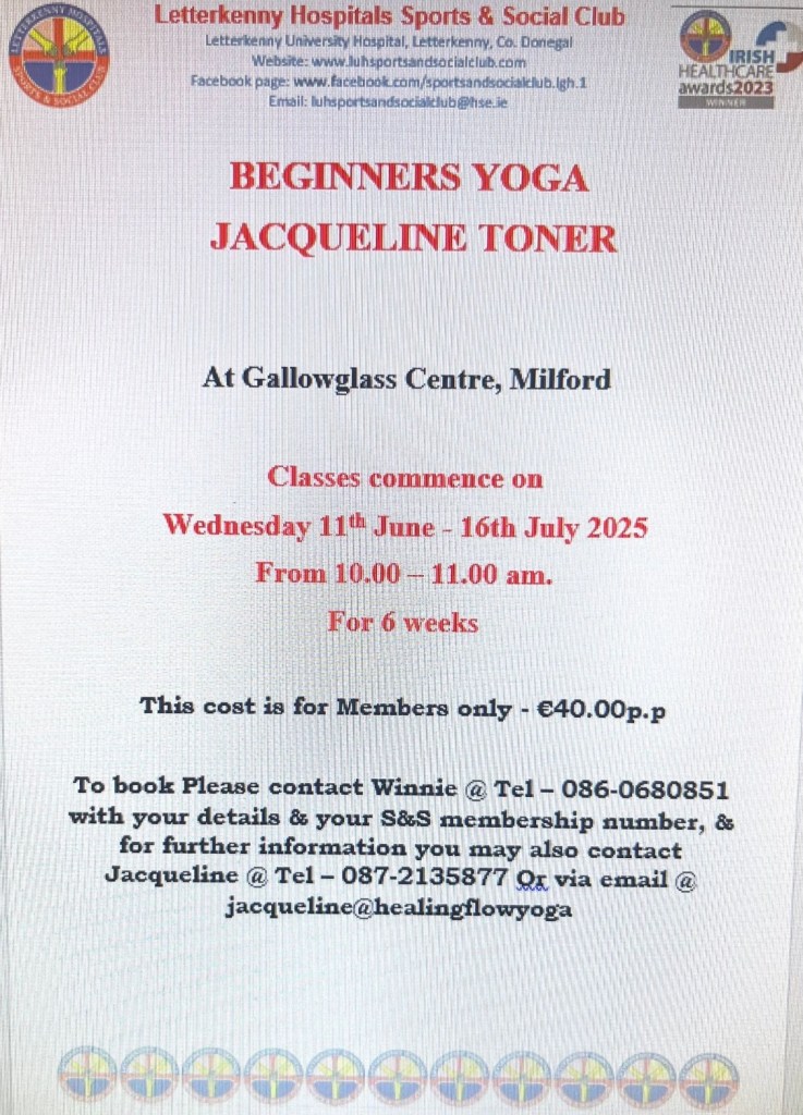 Please see attached poster for further information & booking details for Beginner’s Yoga with Jacqueline Toner in Milford & Church Lane, Letterkenny. Posted by0860801074mJune 5, 2025June 6, 2025Posted inUncategorized Share this: Click to share on X (Opens in new window) X Click to share on Facebook (Opens in new window) Facebook Like Loading...