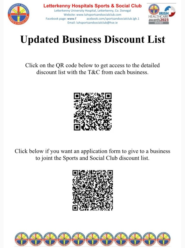 We have updated our Letterkenny Hospitals Sport & Social Club Business Discount List for 2025. To make things easier for everyone all you have to do is click on the QR code to access all of the information. We have included a QR code for application forms to encourage business to join our list of businesses