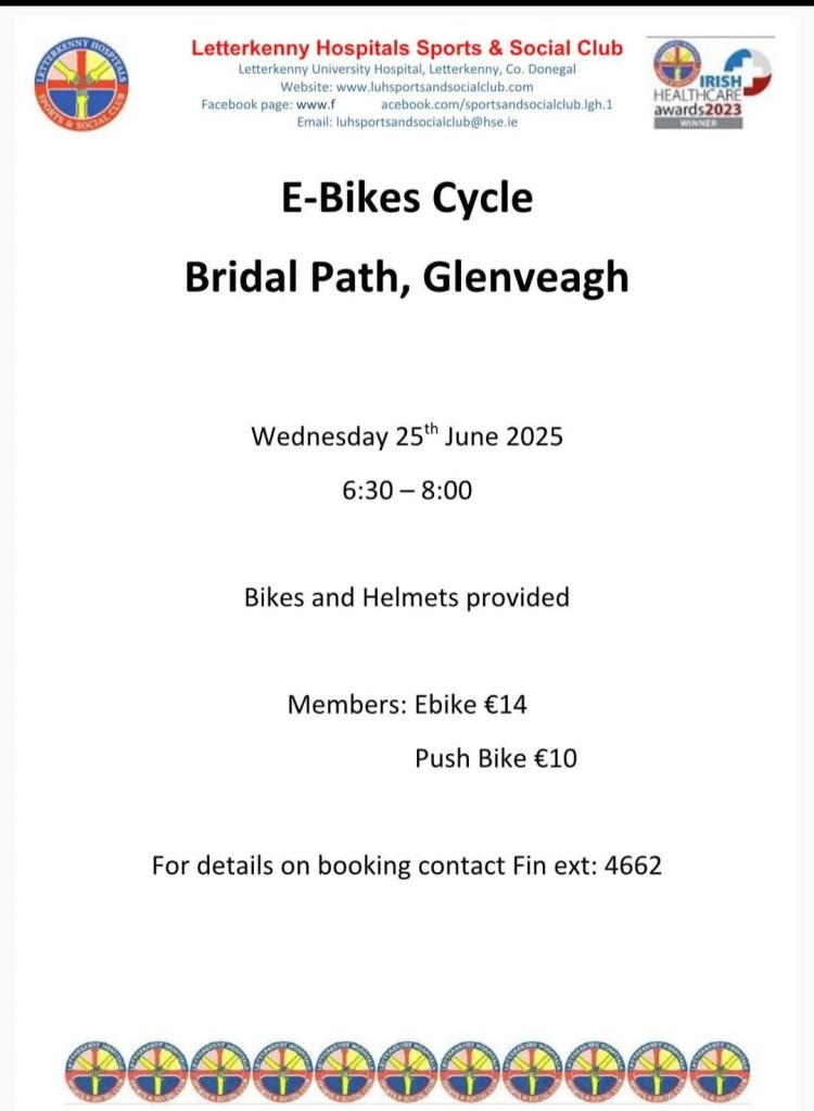 We have another of our popular E-Bike cycles along the Bridal Path Glenveagh, on Wednesday 25th June 2025. Please see poster attached for further information & booking details. Posted by0860801074mJune 17, 2025Posted inUncategorized Share this: Click to share on X (Opens in new window) X Click to share on Facebook (Opens in new window) Facebook Like Loading...