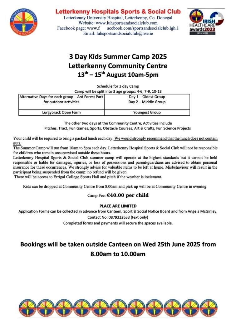 Application forms can now also be downloaded from our website https://luhsportsandsocialclub.com You go into Menu and then click on Forms etc and click on “Kids Summer Camp 2025”. Our Letterkenny Hospitals Sports and Social Club Kids Summer Camp will be taking place this year from Wed 13th – Fri 15th August 2025. Please see poster attached for further information & booking details. Registration will take place on Wed 25th June 2025 from 8am – 10am outside the Staff Canteen, LUH. Can i please remind everyone who is interested in taking their children to this years Summer Camp to kindly collect a form and have it filled out for registration. We would also like to remind you that we can only accept Cash payments & it would be really helpful if you could bring the exact amount.