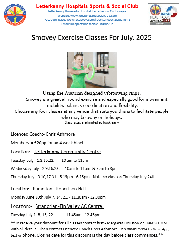 Our next course of Smovey Classes for July. You can choose any four classes at any venue that suits you, this is to facilitate people who may be away on holiday. Please see poster for Location and days/times of classes. For more information and on details on how to book please see poster.