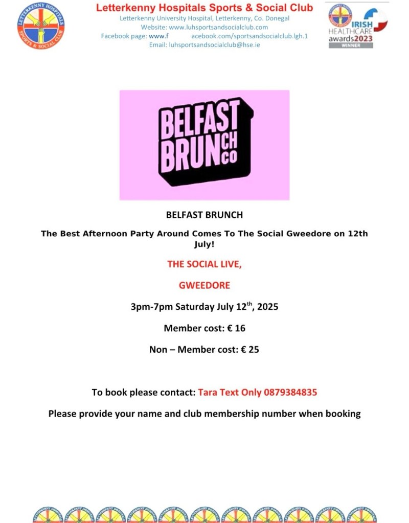 We have tickets for our sports & social members only for – The Social Gweedore who will host the Belfast Brunch Co, on Saturday 12th July, 3pm – 7pm for an incredibly daytime party. The phenomenon everyone is talking about! Join us for an unforgettable afternoon of vibrant music, and endless entertainment as the Belfast Brunch Co. takes over the social! paired with drinks and the energetic beats of DJ’s Jon Boi and Blase. Expert the best of R&B, hip-hop, and classic singalongs in an electric atmosphere that promises to keep you entertained all day long! Please see poster attached for further attached for further information & booking details.