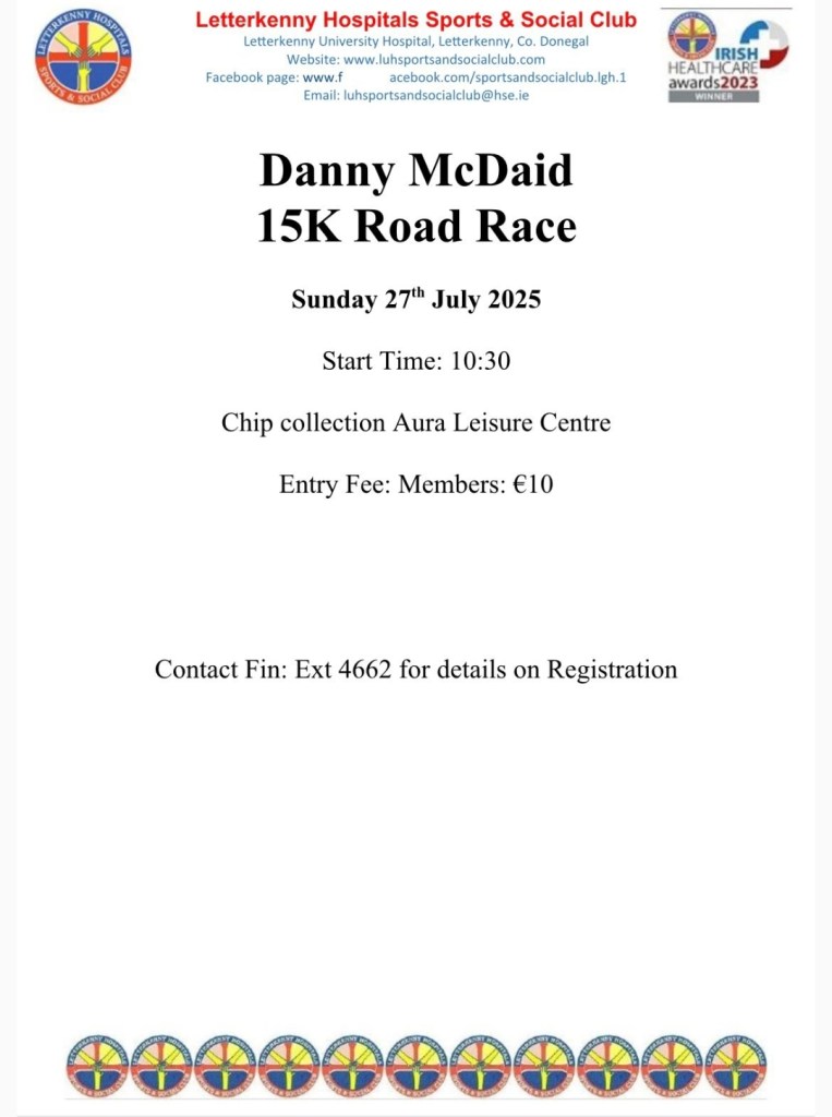 Please find poster attached with information & booking details on the Danny McDaid 15k Road Race on Sunday 27th July 2025. The Letterkenny University Hospital Sports and Social Club will be offering a discount for this race. Posted by0860801074mJuly 3, 2025Posted inUncategorized Share this: Click to share on X (Opens in new window) X Click to share on Facebook (Opens in new window) Facebook Like Loading...