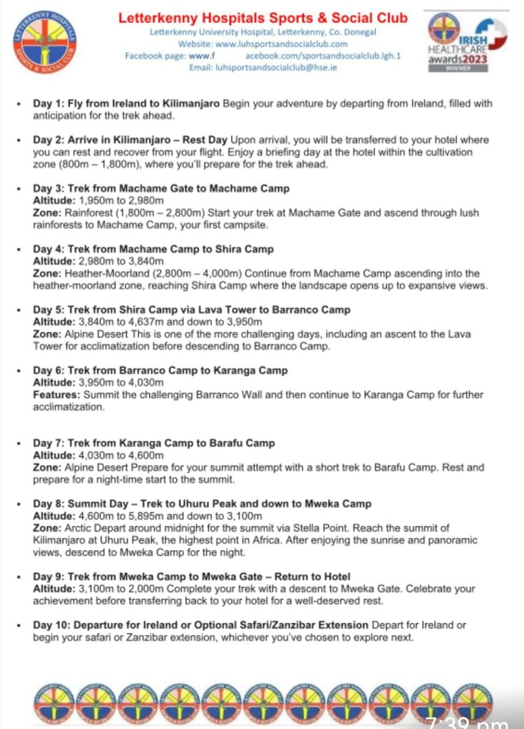 Trip of a lifetime to Kilimanjaro on the 12th September 2026 with the Letterkenny Hospitals Sports and Social Club. As previously discussed we now have the prices for anyone who is interested in this fabulous trip to Africa’s highest peak. Please find all of the prices and detailed information on this trip attached. For further information you can contact Fin Begley on Ext 4662.