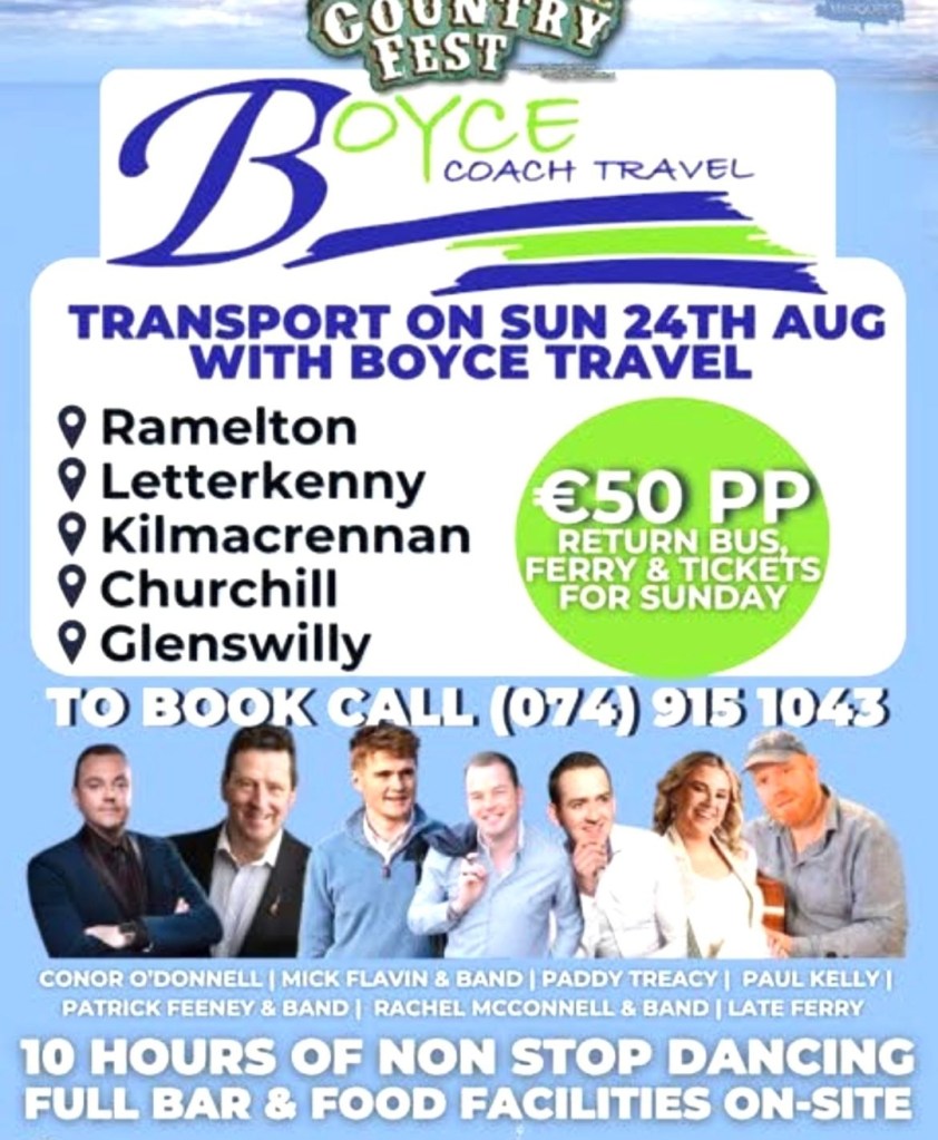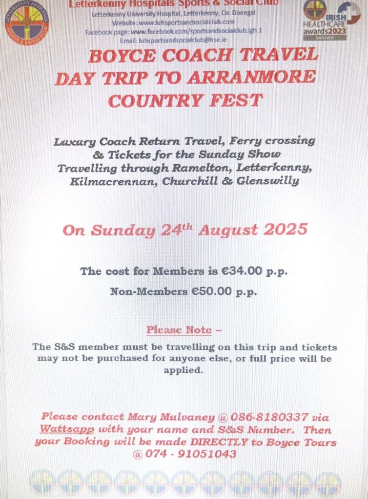 We still have some availability for this day trip to Arranmore Country Fest on Sunday 24th August 2025 with Boyce Tours. Please see poster for further information & booking details. This discounted price is for members only and they must be travelling to the event to avail of this