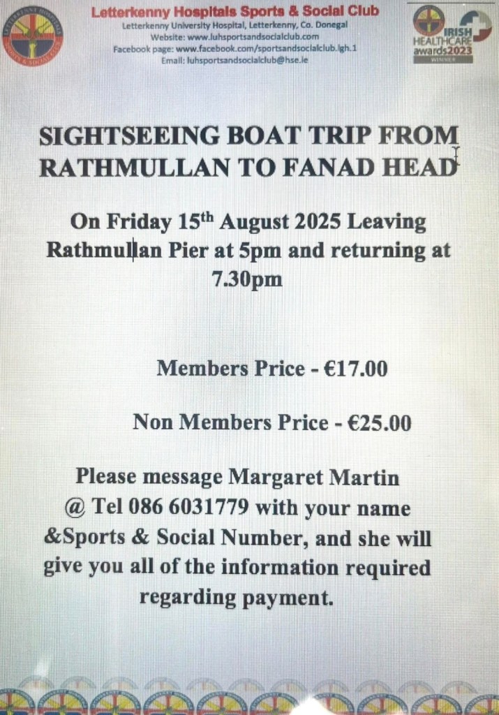 We still have a few spaces left for this lovely sightseeing boat trip, for any of our members wishing to see Fanad coastline. Friday 15th August 2025. Please see poster attached for further information & booking details. Posted by0860801074mAugust 11, 2025Posted inUncategorized Share this: Click to share on X (Opens in new window) X Click to share on Facebook (Opens in new window) Facebook Like Loading...
