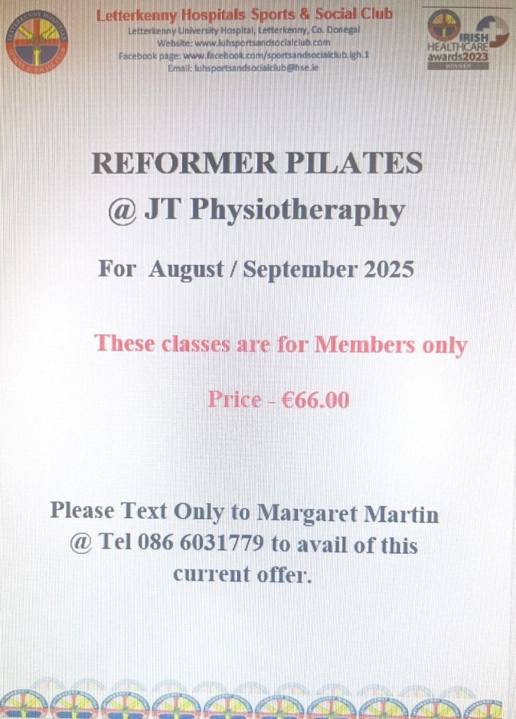 We have our Reformer Pilates with JT Physio starting again for July / August 2025. Please see poster attached for further information & booking details. Posted by0860801074mAugust 18, 2025Posted inUncategorized Share this: Click to share on X (Opens in new window) X Click to share on Facebook (Opens in new window) Facebook Like Loading...