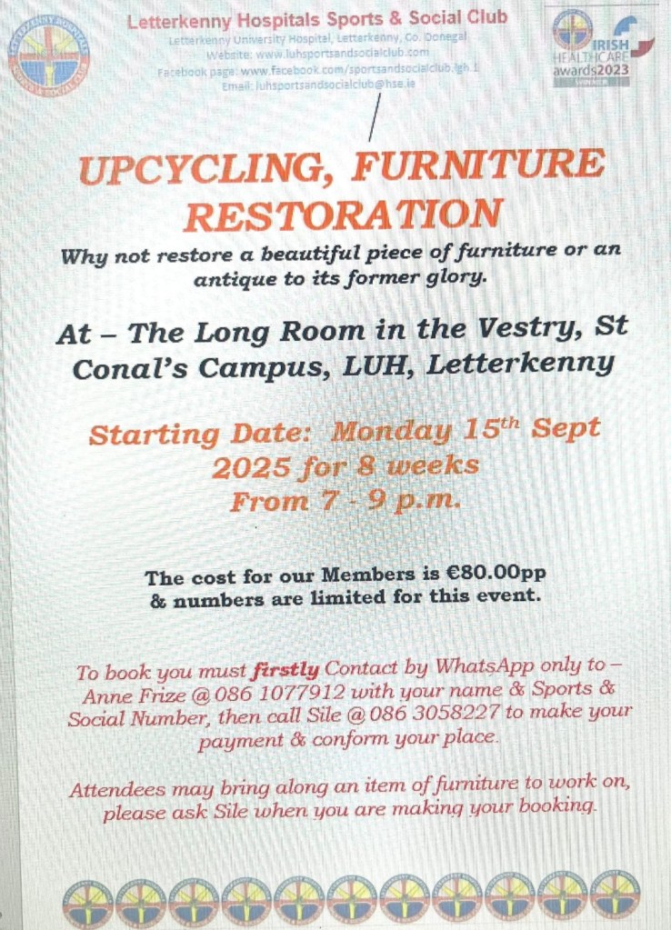 We have a new class of upcycling & furniture restoration. This is starting on Monday 15th Sept 2025 for 8 weeks. There is limited availability for this class, so if you are interested please contact Anne at the number given below as soon as possible. Also please see poster attached for further information & booking details.