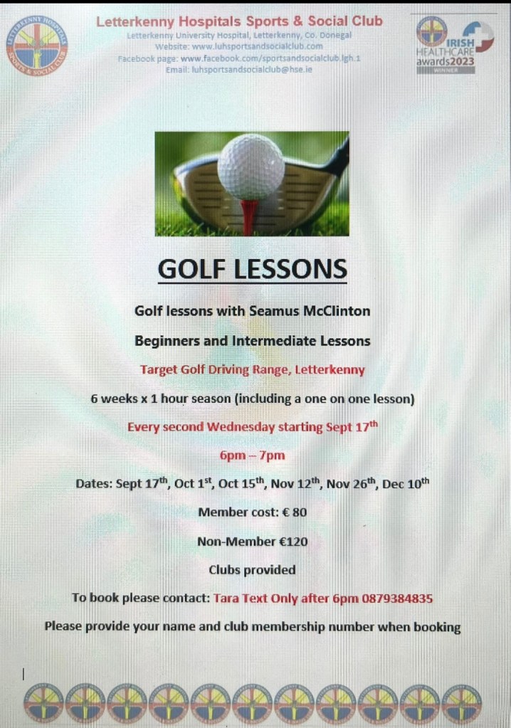 Beginners & Intermediate Golf Lessons every 2nd Wednesday starting 17th Sept 2025 6 weeks course x 1 hour (inc 1 one on one). All equipment and golf balls provided. Members = €80.00pp Non members = €120.00pp. Pleases Contact Tara @ number given on poster attached.