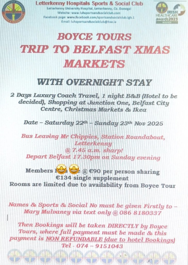 Spaces are filling up for this popular overnight Boyce Tours and if you are interested please book as soon as you can . We have a trip organised to the Christmas Markets with Boyce Bus Tours to Belfast with an overnight stay on Sat 22nd – 23rd Nov 2025. Please see poster attached for further information & booking details.