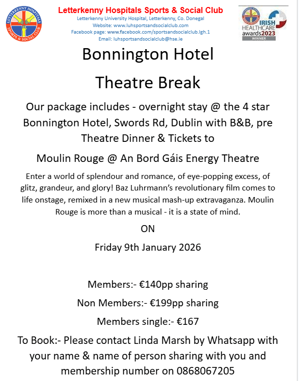 We have a fabulous overnight trip to the Bonnington Hotel. Including B&B, Pre-Theatre Dinner, Tickets to the Moulin Rouge show at Board Gáis Energy Theatre, Transfers to/from Board Gáis Energy Theatre, Access to Leisure Centre & Pool, Complimentary Parking. Please see poster attached for further information and details on how to book.