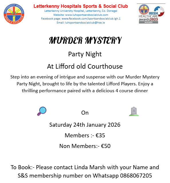 We have an evening of intrigue and suspense with our Murder Mystery Party Night. Book early to avoid disappointment. Please see poster attached for further information and details on how to book. Posted by0860801074mOctober 11, 2025Posted inUncategorized Share this: Click to share on X (Opens in new window) X Click to share on Facebook (Opens in new window) Facebook Like Loading...