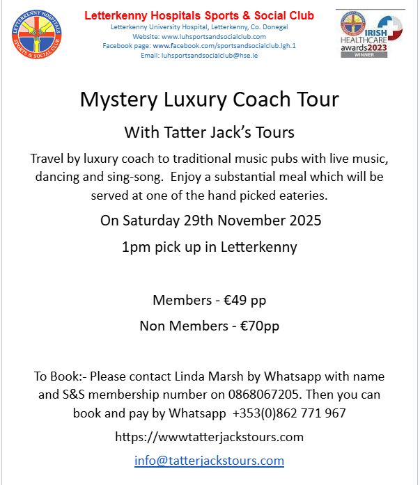 We have another Mystery Luxury Coach Tour with Tatter Jack’s Tour. You will have a unforgettable time from start to finish!! Please book early as places are limited. See posters attached for further information and details on how to book. Posted by0860801074mOctober 11, 2025Posted inUncategorized Share this: Click to share on X (Opens in new window) X Click to share on Facebook (Opens in new window) Facebook Like Loading...