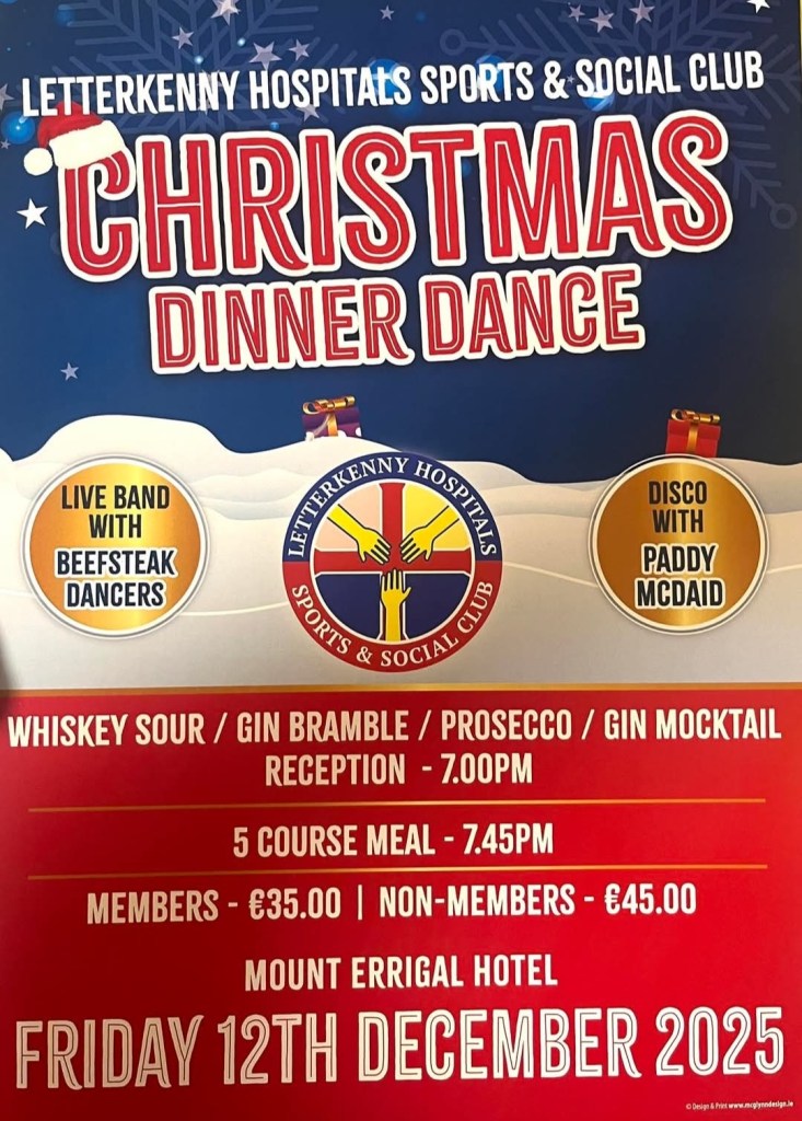 Last call for tickets for this years 2025 LUH Sports & Social Christmas Dinner Dance. So, if any staff or departments are still making up their minds, we would kindly ask that you do so as our final numbers need to be established. We would like to remind you that there will be lots of prizes to be won on the night for members as well as our big draw cash prizes. For anyone who hasn’t been before, we can promise a great night of fun & entertainment & it’s only €35 for our S&S members & €45 for Non Member Hospital Staff. Please book early to avoid disappointment. Please Contact Angela @087 932 2633 up until Tuesday 25th Nov & Tracy @ 089 260 3444 or Mary @ 086 8180337 until 2nd Dec 2025. Cut off date for return tickets is Tuesday 2nd December at 5pm. Please Contact Tara Gallagher either by email @ tara.gallagher1@hse.ie or at Ext – 4783.