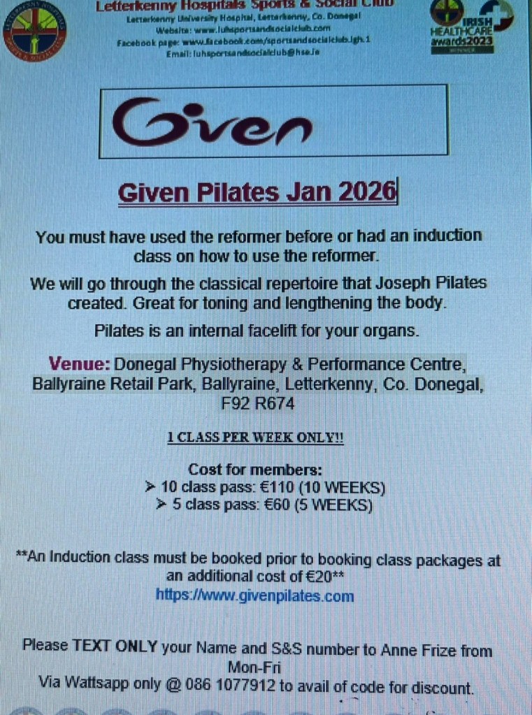 We have Given Pilates restarting for January 2026. Please se poster for further information & booking details. Please note that it is only 1 class per week that can be booked & these classes @ this price are for LUH Sports & Social Club members only.