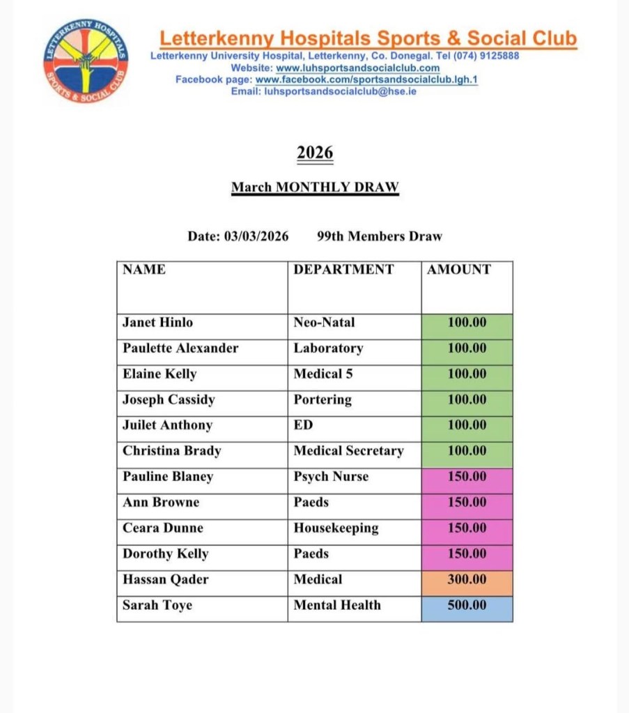 Congratulations to all of the winners of our draw for March 2026. Just to let everyone know that the winners may contact Tara Gallagher either by email @ tara.gallagher1@hse.ie or @ Ext – 4783 to let her know where to post the cheque to. A special congratulations to Joseph Cassidy who retired last week and won in this month’s draw also…Cheers to you.