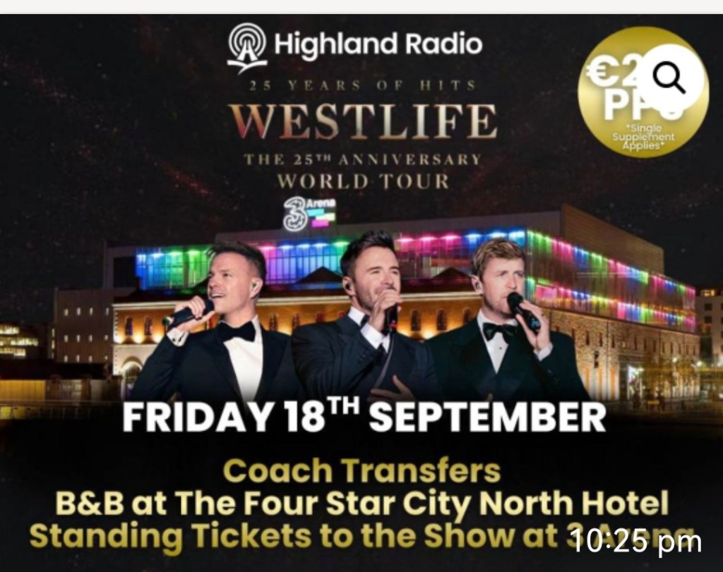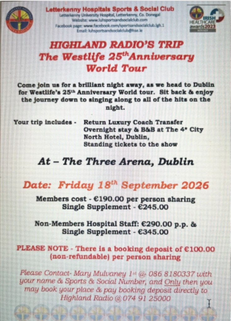 We have a trip for our Letterkenny Hospitals Sports & Social Clulb members to the 25th Westlife Anniversary World Tour Concert @ the Three Arena Dublin With Highland Radio Tours on Friday 18th Sept 2026. This trip allows you to sit back on their Luxury return coach transfer, overnight B&B @ the 4* City North Hotel Dublin & Standing tickets to reminisce their tunes from 1998 onwards. Please see poster attached for further information & booking details.