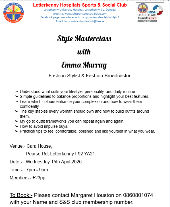 Ladies we have a style Masterclass for you on Wednesday 15th April 2026, with stylist Emma Murray. See poster for further information and details on how to book. Posted by0860801074mApril 3, 2026Posted inUncategorized Share this: Share on X (Opens in new window) X Share on Facebook (Opens in new window) Facebook Like Loading...