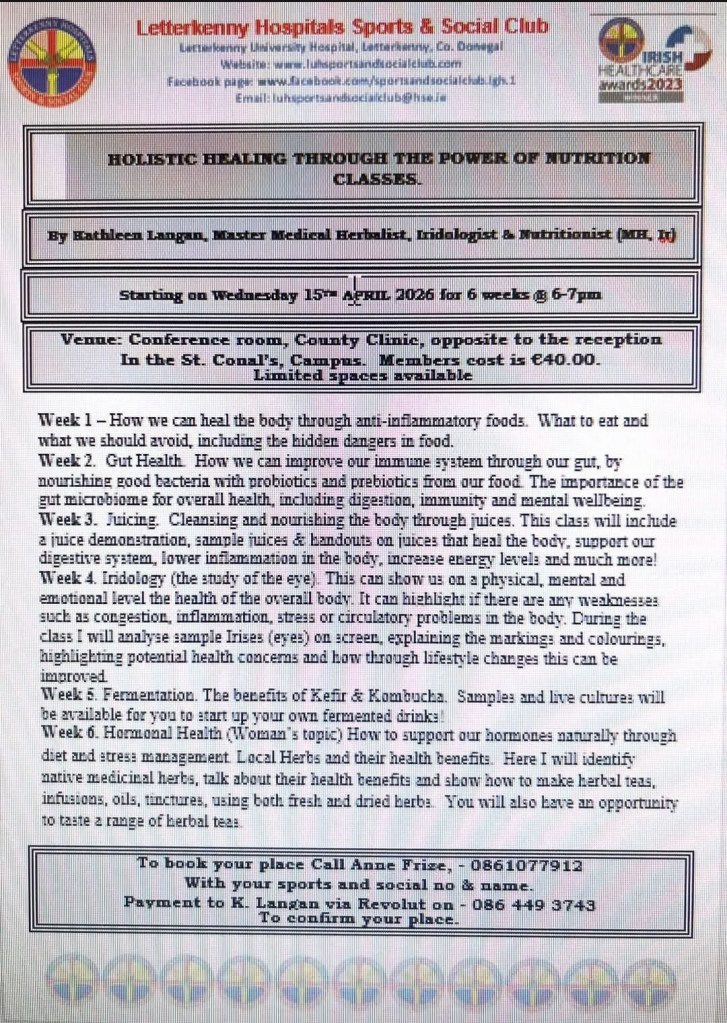 Our Medical Herbalist, Iridologist & Nutritionist workshop will now be starting on Wednesday 15th April 2025 and will run for 6 weeks. This is an interesting course and because numbers are limited it is for members only. Please see poster attached for further information and booking details.