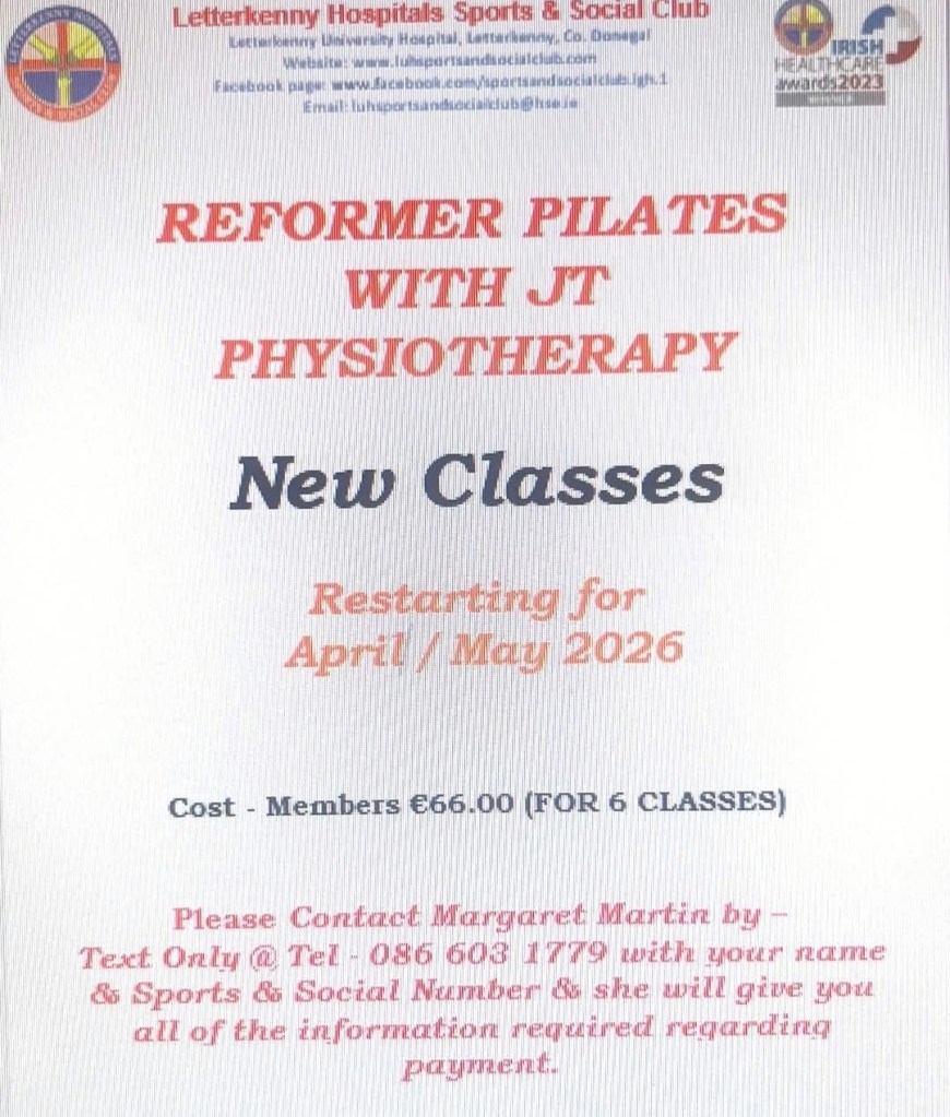 We have classes available for our Reformer Pilates with JT Physio in Letterkenny for April/May 2026. Please see poster attached for further information & booking details. Posted by0860801074mApril 8, 2026Posted inUncategorized Share this: Share on X (Opens in new window) X Share on Facebook (Opens in new window) Facebook Like Loading...