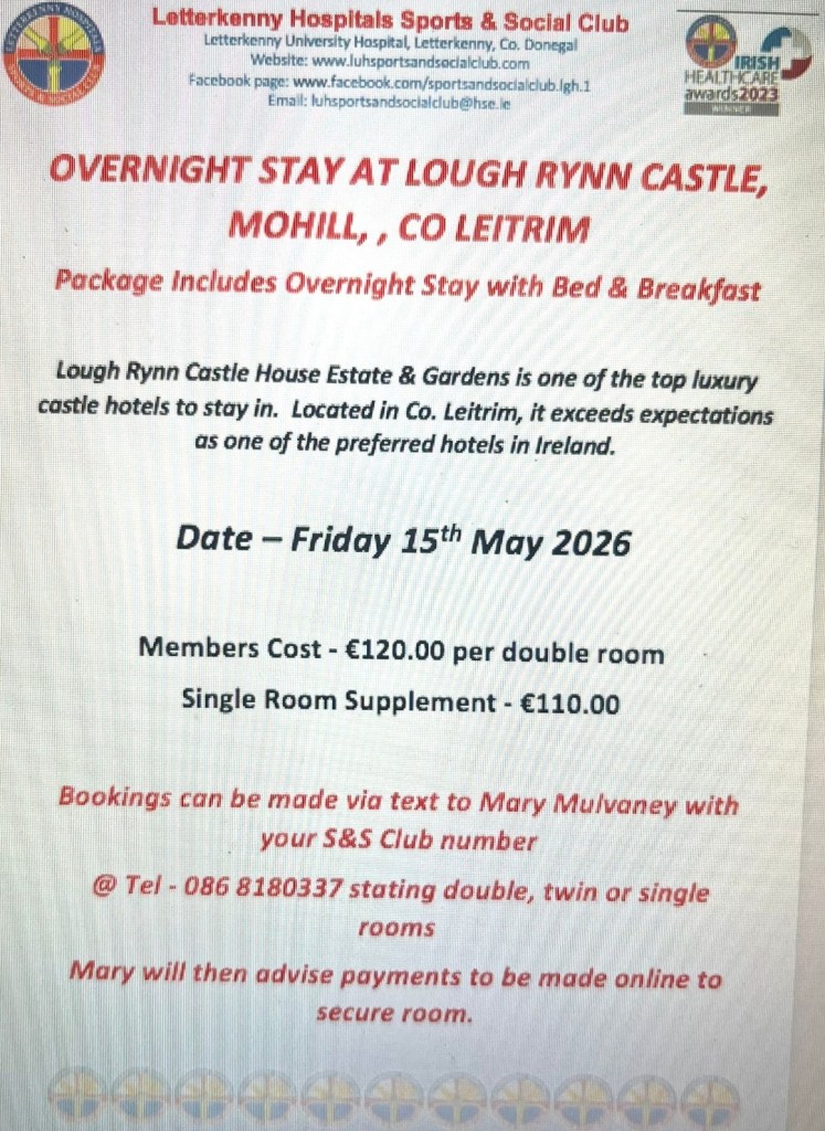 We have an overnight stay at the beautiful Lough Rynn Castle, Mohill, Co. Leitrim on Friday 15th May 2026. Please see poster attached for further information & booking details. Posted by0860801074mApril 9, 2026Posted inUncategorized Share this: Share on X (Opens in new window) X Share on Facebook (Opens in new window) Facebook Like Loading...