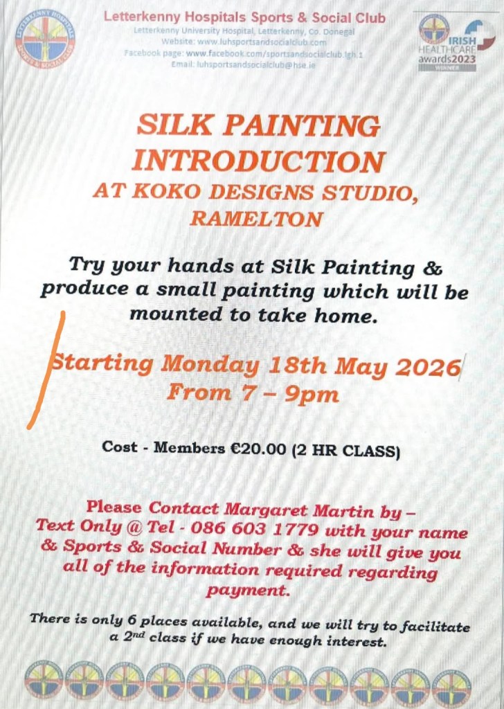 We have a new class of introduction of Silk Painting. The class is for 2 hours on Monday 18th May 2026 from 7 -9 pm . Please see poster attached for further information & booking details. Posted by0860801074mApril 10, 2026Posted inUncategorized Share this: Share on X (Opens in new window) X Share on Facebook (Opens in new window) Facebook Like Loading...