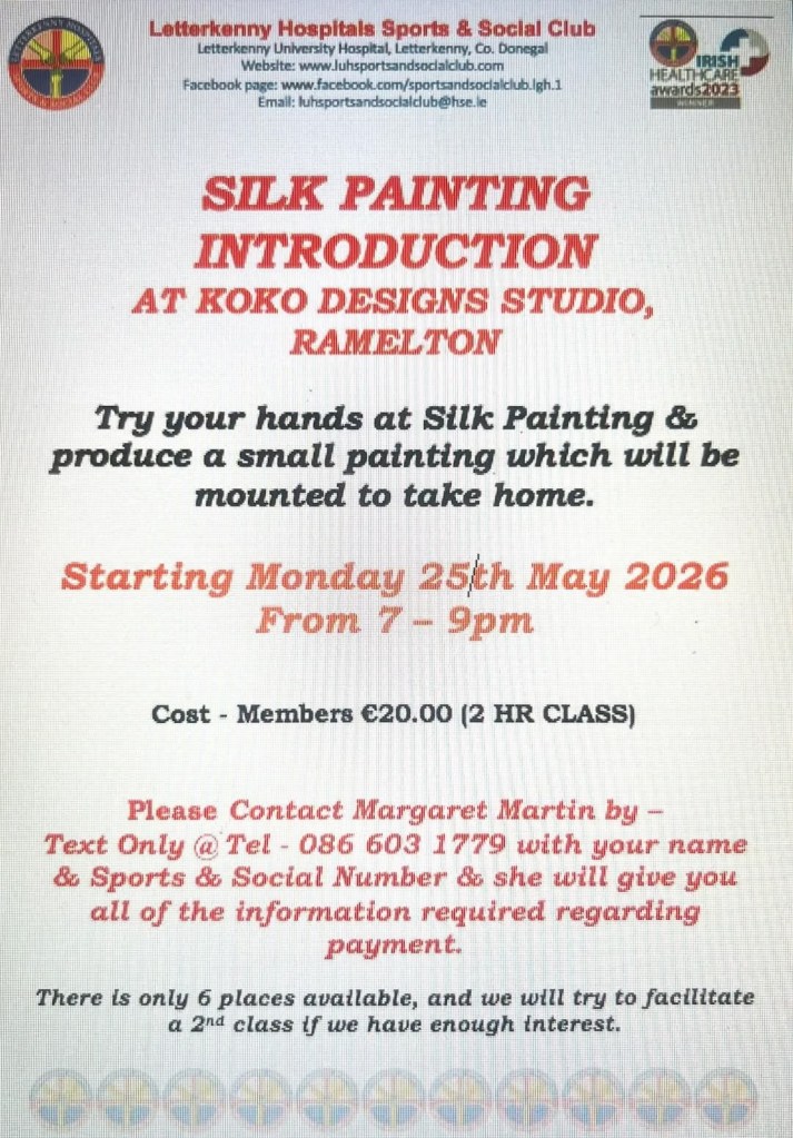 We have another date available for Introduction Silk Painting on Monday 25th May 2026. Please see poster attached with further information & booking details. Posted by0860801074mApril 24, 2026Posted inUncategorized Share this: Share on X (Opens in new window) X Share on Facebook (Opens in new window) Facebook Like Loading...